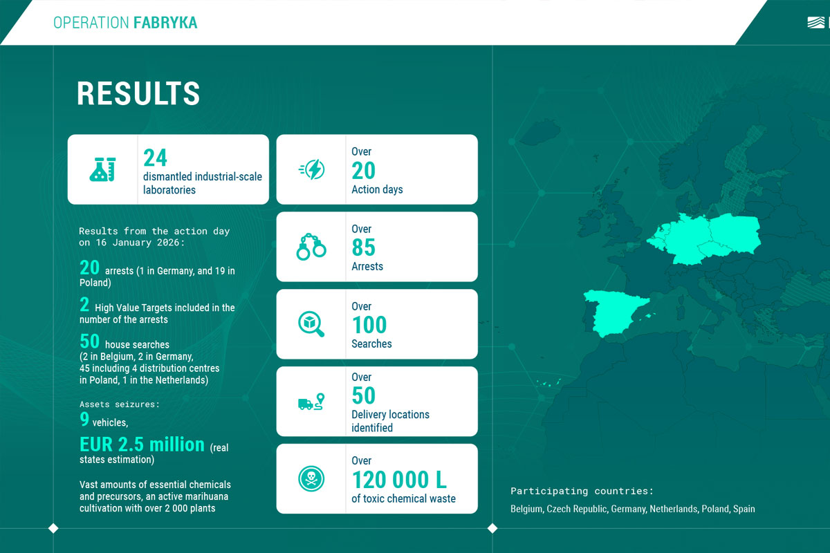 Im Rahmen der Operation „Fabryka“ wurden 24 groß angelegte Drogenlabore geschlossen. Europol spricht vom größten Einsatz gegen synthetische Drogen in der Geschichte der Behörde.