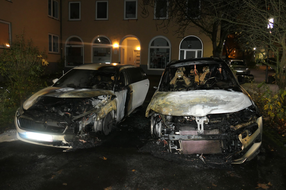 Gegen 19:30 Uhr meldeten Passanten das Feuer, das zwei Skoda – einen Octavia und einen Karoq – vollständig zerstörte.