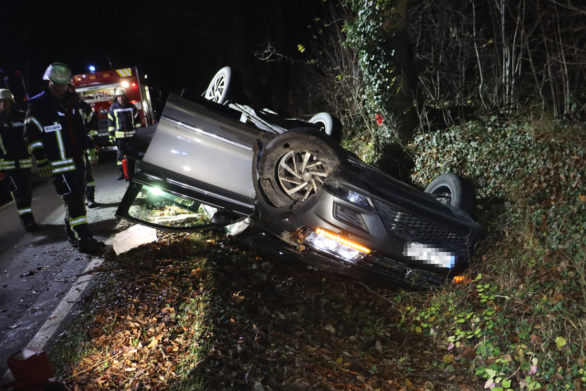 Am Montagabend, 17.11.2025, kam ein 83-jähriger Fahrer auf der L755 bei Langeland von der Straße ab. Sein VW Tiguan überschlug sich im Straßengraben und blieb auf dem Dach liegen. Der Mann wurde schwer verletzt ins Krankenhaus Paderborn gebracht.