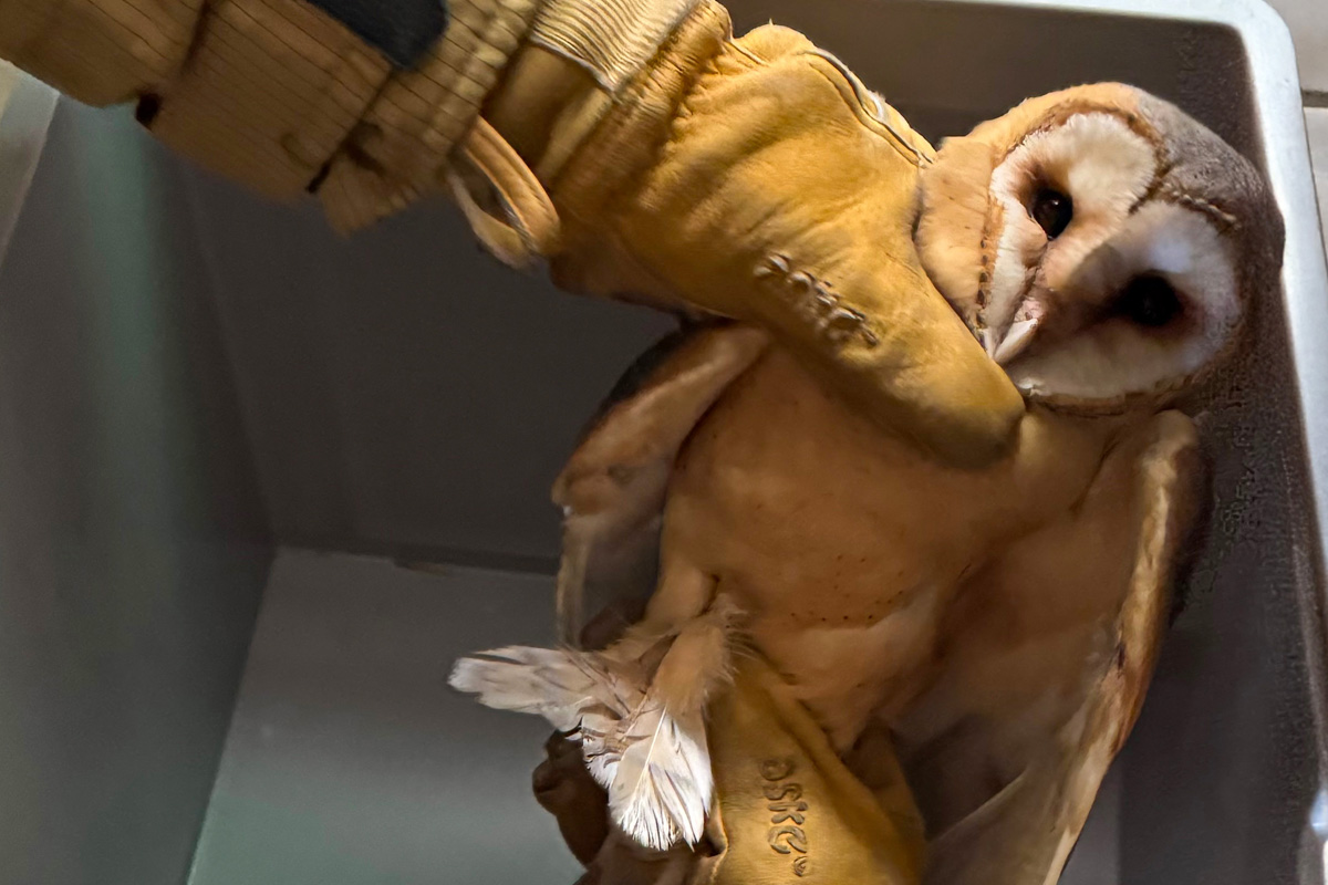So konnte ein im Umgang mit Wildvögeln erfahrener Feuerwehrmann, der glücklicherweise mit ausgerückt war, die Eule vorsichtig befreien und in einer Transportbox sichern.