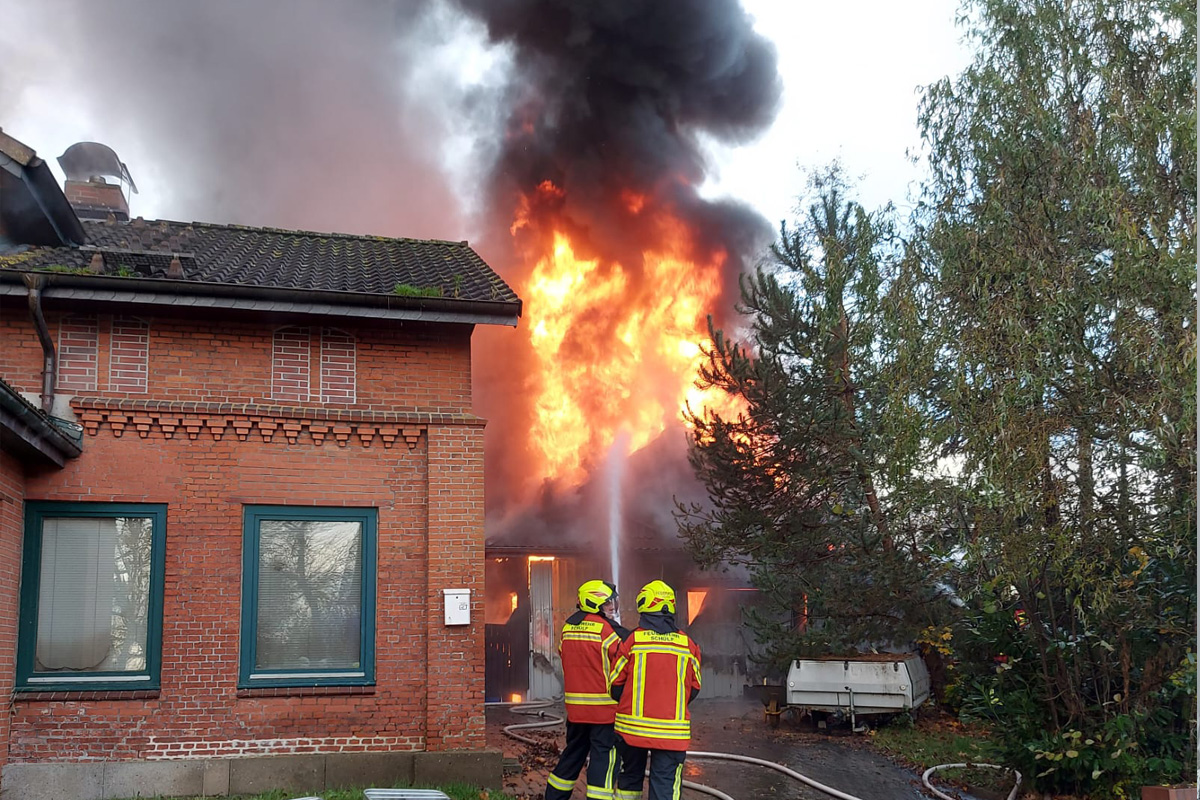 Am Montagmorgen, 17.11.2025, brannten in Schülp (SH) zwei Gebäude auf einem Grundstück lichterloh. Die Feuerwehr barg im stark verrauchten Erdgeschoss eines Wohnhauses eine leblose Person – der Rettungsdienst konnte nur noch den Tod feststellen.