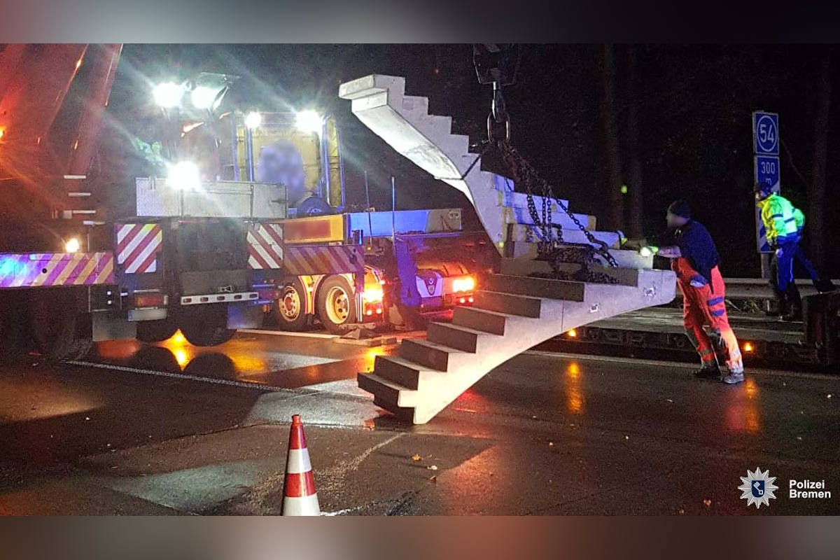 Gegen 18:55 Uhr war der 24-jährige Fahrer eines Sattelzuges auf der Autobahn 1 in Richtung Hamburg unterwegs. Auf Höhe der Abfahrt Mahndorf fiel das fast sechs Tonnen schwere Betonelement vom Auflieger und prallte auf die Fahrbahn. Anschließend wurde die Treppe noch über 100 Meter mitgeschliffen. Die dahinter fahrenden Fahrzeuge konnten rechtzeitig abbremsen, so dass lediglich drei Autos durch abgesplitterte Teile leicht beschädigt wurden.