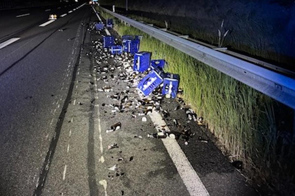 Hierdurch wurde der Anhänger so beschädigt, dass die seitliche Wand des Anhängers aufriss, drei Reifen platzten und mehrere Kisten mit gefüllten Bierflaschen auf die Fahrbahn fielen.
