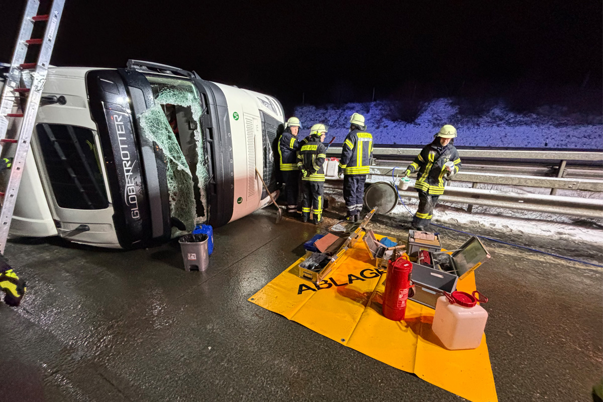 Am Montagabend, 16.02.2026, verunfallte ein Sattelzug auf der A1 zwischen Sittensen und Heidenau (NI) und kippte auf die Seite. Der Fahrer wurde verletzt in ein Krankenhaus gebracht. Aus einem beschädigten Tank liefen größere Mengen Diesel aus.