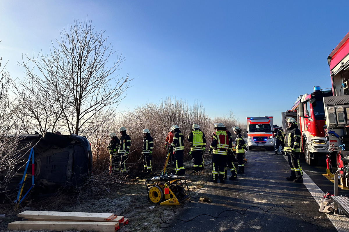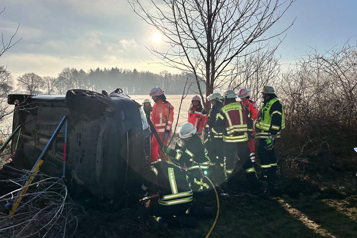 Nach Angaben der Kreisfeuerwehr Rotenburg (Wümme) kam die Fahrerin eines Volvo aus bislang ungeklärter Ursache von der Fahrbahn ab. Das Fahrzeug kam seitlich im Seitenraum zwischen mehreren Bäumen zum Stehen und lag dabei auf der Fahrerseite.