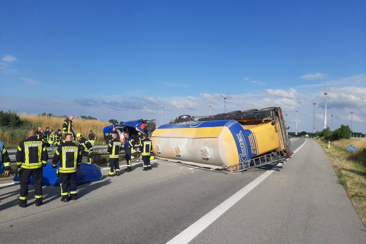 Zwischen den Ausfahrten Neubrandenburg Ost und Friedland kam der LKW aus bisher ungeklärter Ursache nach links von der Fahrbahn ab, durchfuhr die Mittelleitplanke und kippte über beide Richtungsfahrbahnen auf die Seite. Der Fahrer wurde eingeklemmt und musste von der Feuerwehr geborgen werden. Er verstarb auf dem Weg ins Klinikum Neubrandenburg an seinen lebensbedrohlichen Verletzungen. Beide Richtungsfahrbahnen wurden gesperrt und Umleitungen eingerichtet. Ein Abschleppunternehmen wird zur Bergung des LKW (40- Tonner und mit 28 Tonnen Zement beladen) einen Kran zum Einsatz bringen, welcher 130 Tonnen heben kann. Dies wird noch einige Zeit in Anspruch nehmen. Die Gesamtschadenhöhe beträgt nach derzeitigem Stand ca. 100.000 Euro.