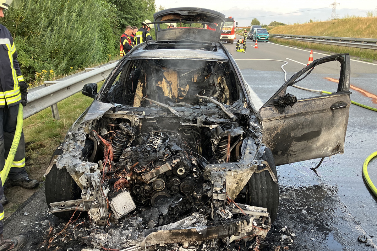 Am Mittwochabend, 16. Juli 2025, ist ein BMW auf der A 26 bei Jork vollständig ausgebrannt. Die 40-jährige Fahrerin und ihr Mitfahrer konnten das Fahrzeug rechtzeitig verlassen. Die Autobahn war bis Mitternacht zeitweise voll gesperrt.