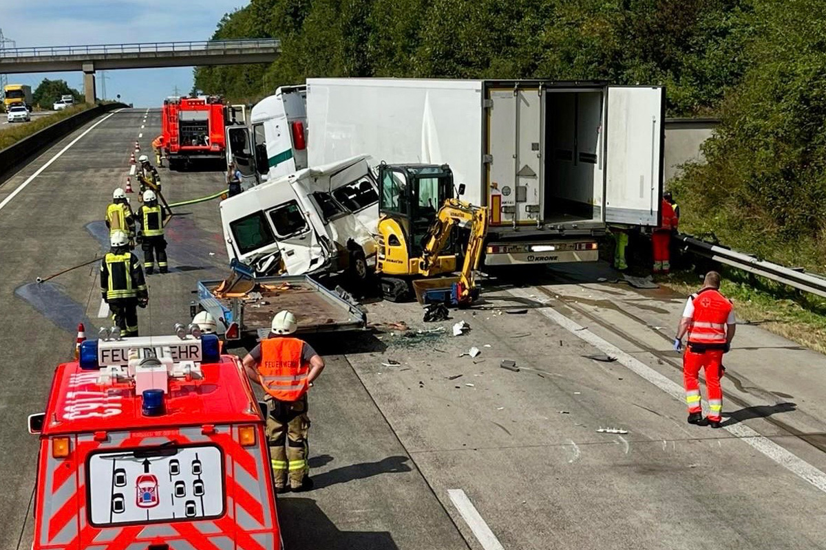 Am Montagmittag (25.08.2025) kollidierten auf der A3 bei Windhagen ein Lkw und ein Transporter mit Anhänger, auf dem ein Bagger verladen war. Die Feuerwehr sicherte den vom Anhänger gerutschten Bagger. Die Autobahn musste zeitweise voll gesperrt werden, es kam zu langen Staus.
