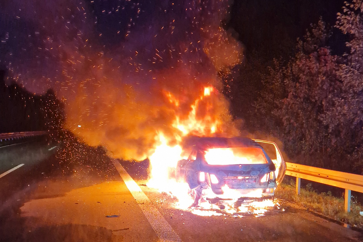 In der Nacht zum Montag, 20.10.2025, brannte auf der A31 bei Bottrop (NW) ein Auto vollständig aus. Die drei Insassen konnten sich rechtzeitig in Sicherheit bringen und blieben unverletzt. Die Feuerwehr löschte den Brand mit rund 1200 Litern Wasser.