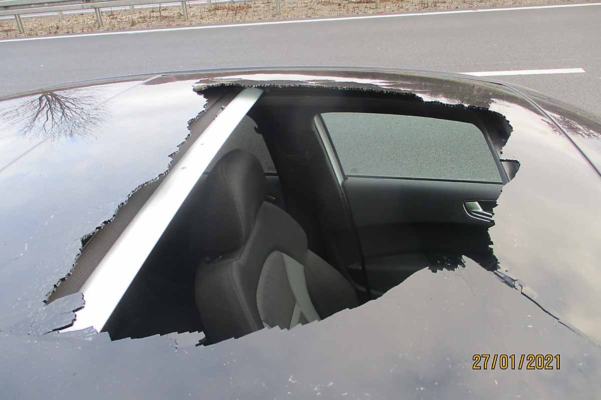 Frau vernahm einen Knall und musste daraufhin ein ca. 50cm großes Loch in ihrem Panoramadach in Wolfenbüttel feststellen (Bildquelle: Polizei Braunschweig)