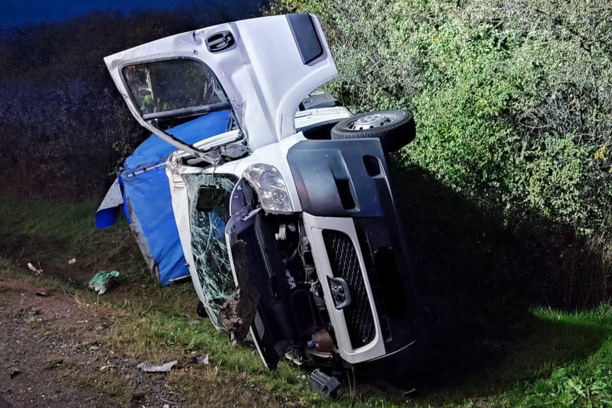 Autotransporter kommt auf der Autobahn von Fahrbahn ab und kippt um! (Bildquelle: Thüringer Polizei)