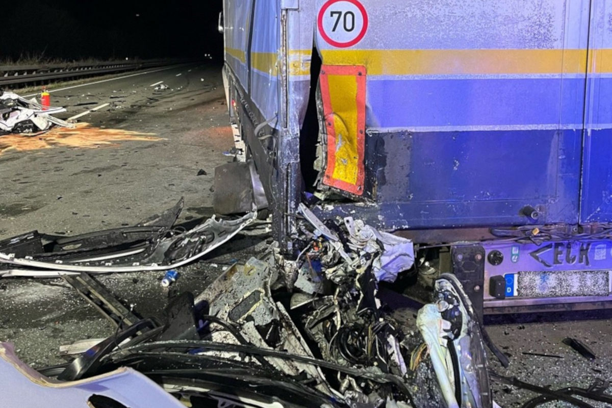 Der Pkw prallte zunächst gegen einen stehenden Sattelzug. (Bildquelle: Polizeipräsidium Bielefeld)