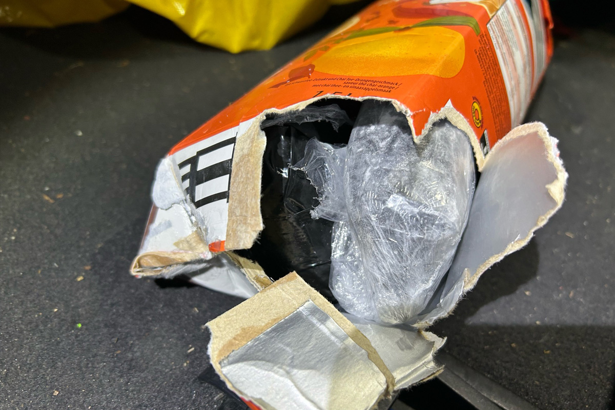 Beim Aufschneiden des Bodens eines Kartons kamen drei mit schwarzem Panzertape umwickelte Pakete zum Vorschein. Beim Öffnen eines dieser Pakete wurde eine weiße Substanz sichtbar. Auch im zweiten Karton befanden sich drei Pakete mit weißem Pulver.