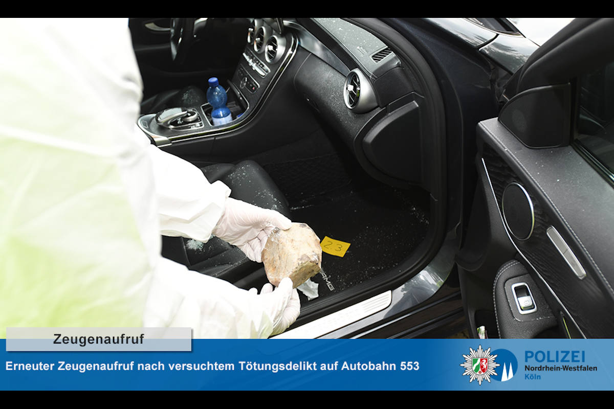 Nach dem versuchten Tötungsdelikt durch das Werfen eines faustgroßen Steins von der Phantasialandstraße auf die Autobahn 553 am Freitagnachmittag (9. Juli) ist die 57-jährige Beifahrerin der Mercedes C-Klasse zwischenzeitlich aus dem Krankenhaus entlassen worden.