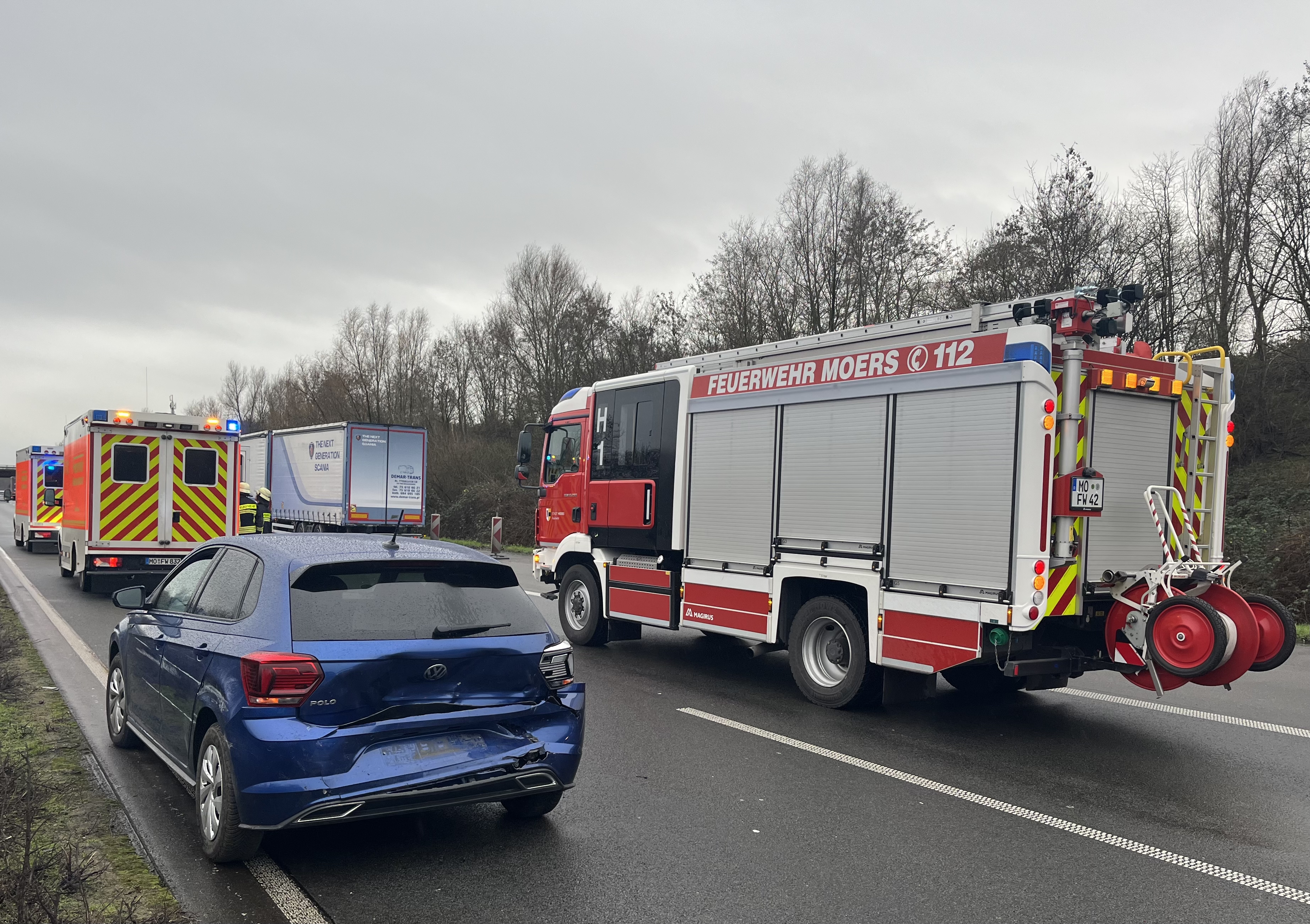 Nach rettungsdienstlicher Versorgung wurden alle drei Patienten den umliegenden Krankenhäusern zugeführt. Als positiv bleibt eine vorbildlich gebildete Rettungsgasse ab dem Autobahnkreuz Kamp-Lintfort zu erwähnen, die Anfahrt durch den Rückstau verlief nahezu problemlos.