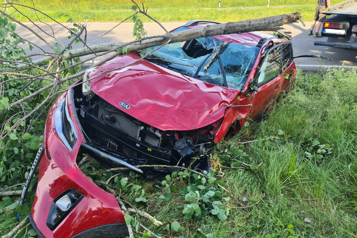 Der PKW war von der Straße abgekommen, hatte sich offensichtlich mehrfach und war dann vollständig in einer Grünfläche mit dichtem Gebüsch auf dem Dach liegend gelandet - von außen nicht mehr erkennbar. Wäre der Unfall bei Dunkelheit und ohne Unfallzeugen geschehen, so wäre vermutlich mit einem schlimmeren Ausgang zu rechnen gewesen.