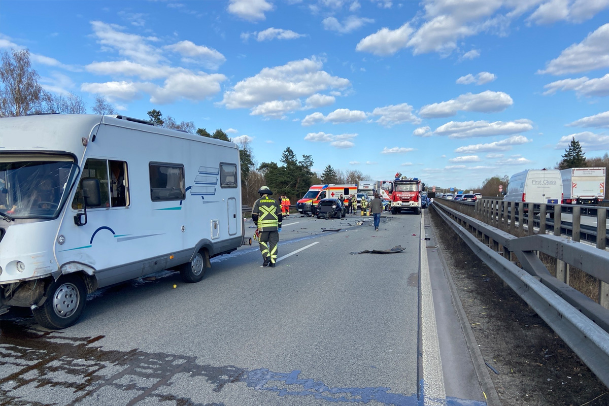 Dieser drehte sich ein und es kam zur Kollision mit insgesamt drei weiteren Fahrzeugen, darunter auch einem Lastkraftwagen und einem Wohnmobil.