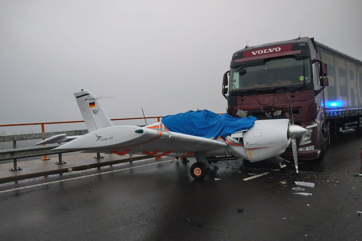 Am Samstag, 04.12.2021, staunten die Polizeibeamten der PI Waldfischbach-Burgalben nicht schlecht, als ihnen um kurz nach 12:00 Uhr der Zusammenstoß eines Sattelzuges mit einem Propellerflugzeug mitten auf der Schwarzbachtalbrücke der A62 nahe Höheinöd gemeldet wurde.