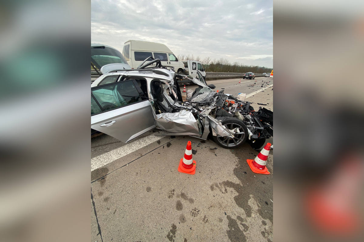 Der Fahrer konnte sich noch selbst aus seinem Fahrzeug befreien. Er wurde schwerverletzt mit dem Rettungswagen in ein nahegelegenes Krankenhaus verbracht. An dem PKW entstand witrschaftlicher Totalschaden. Der Gesmtschaden dürfte sich auf ca. 50.000 Euro belaufen. Für die Dauer der Unfallaufnahme und Bergungsmaßnahmen, war der rechte Fahrstreifen in Richtung Mainz voll gesperrt.