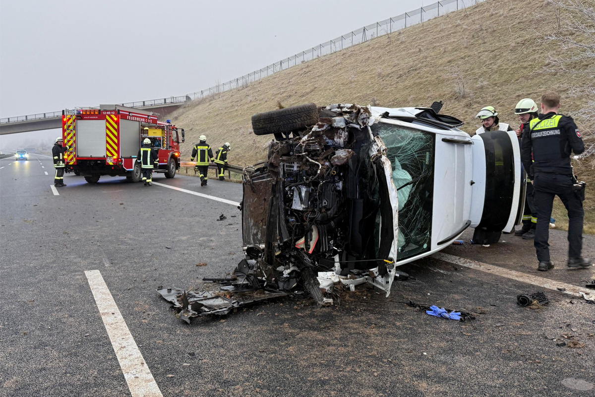Der VW T-Cross prallte gegen einen Erdhügel, schleuderte anschließend zurück auf die Autobahn und blieb auf der Fahrerseite liegen.