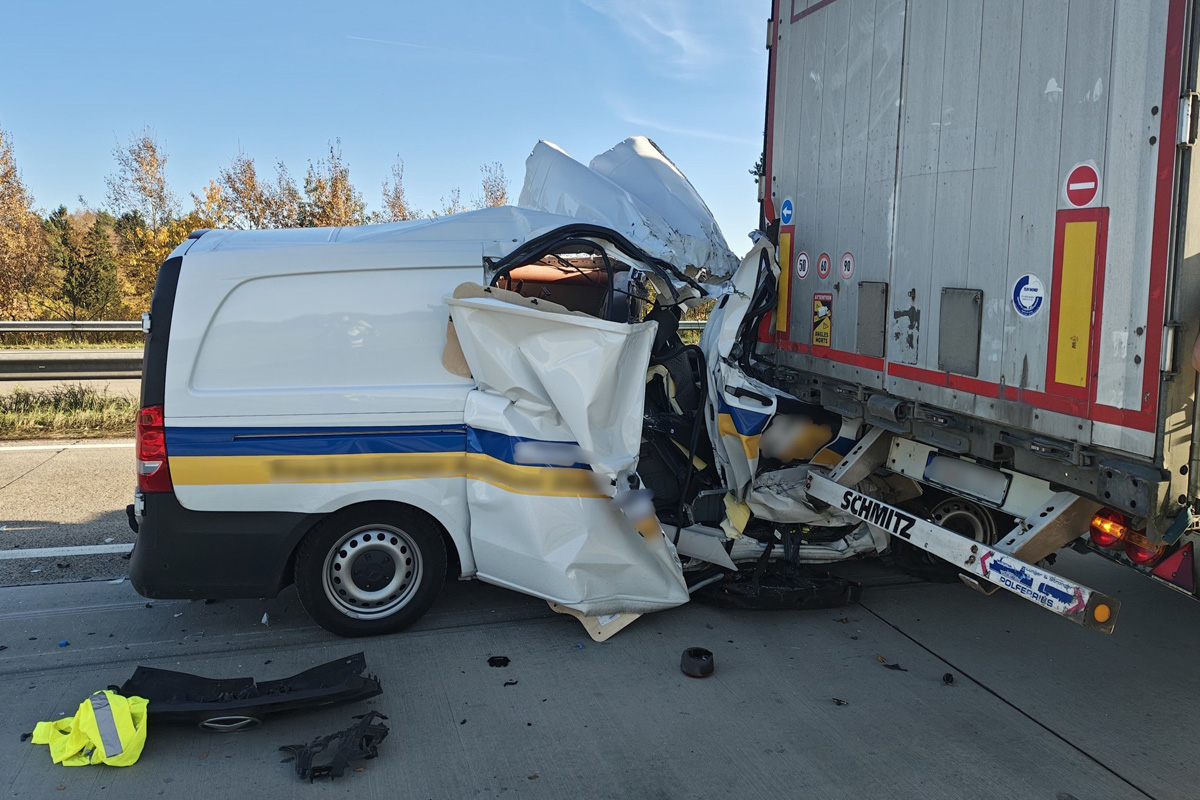 Am Donnerstagnachmittag, 06.11.2025, kam es auf der A7 bei Soltau (NI) zu einem schweren Auffahrunfall. Ein Kleintransporter fuhr auf einen abbremsenden Sattelzug auf. Trotz des massiven Schadens blieb der 58-jährige Fahrer nur leicht verletzt.