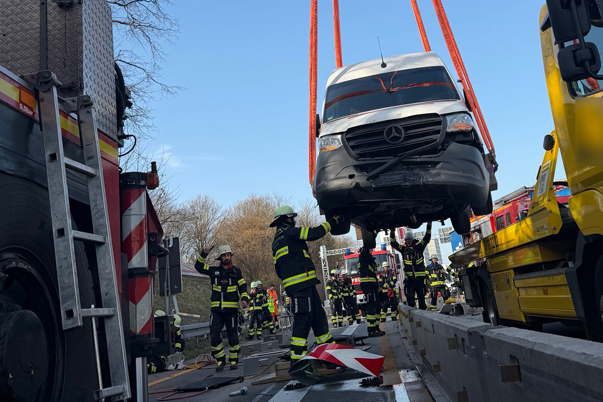 Zunächst glichen die Einsatzkräfte die Schräglage des Unfallfahrzeugs mit Lufthebekissen aus. Anschließend hob der Feuerwehrkran den Kleintransporter von der Mittelleitplanke, sodass er an einen Abschleppdienst übergeben werden konnte.