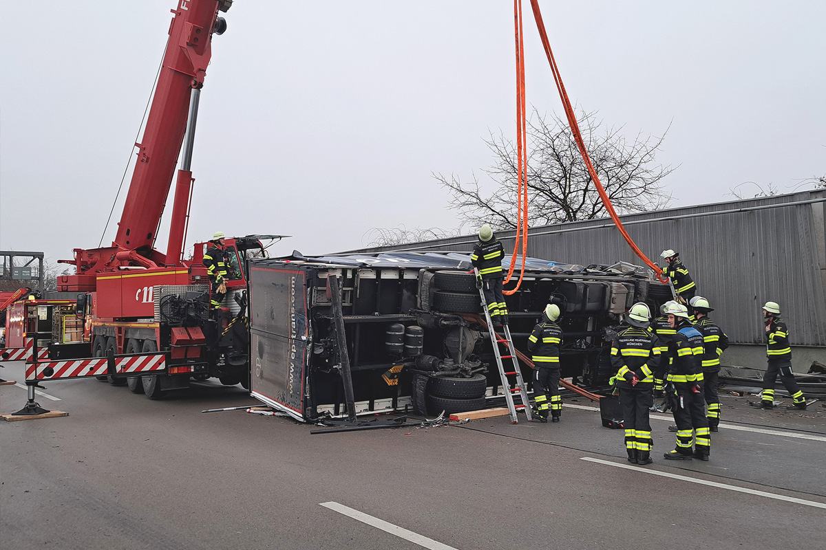 Ein Sattelauflieger fuhr auf einen verkehrsbedingt bremsenden Lkw auf, der daraufhin umkippte und quer über zwei Fahrspuren sowie den Standstreifen zum Liegen kam. Dabei wurde eine angrenzende Lärmschutzwand in Teilen stark beschädigt.