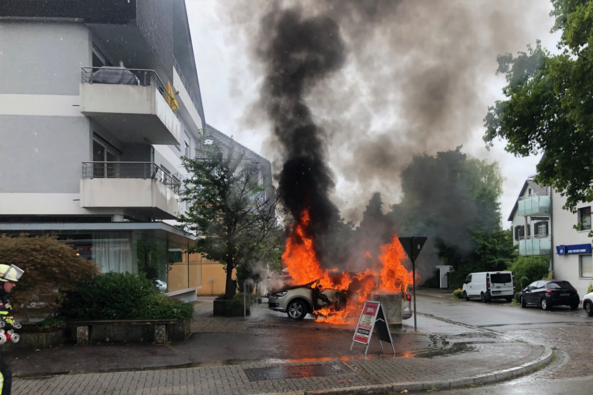 In Achern kam es am Montag, den 7. Juli 2025, zu einem Fahrzeugbrand auf dem Parkplatz eines Wohn- und Geschäftsgebäudes. Die Flammen griffen auf einen Baum über und drohten sich auf das Gebäude auszubreiten.