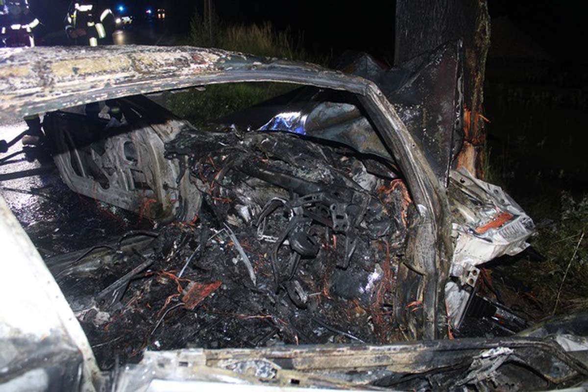 Als Folge der heftigen Kollision geriet der Wagen offenbar in Brand