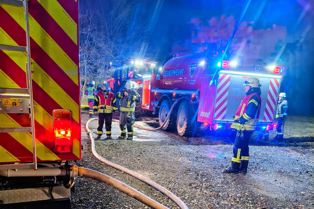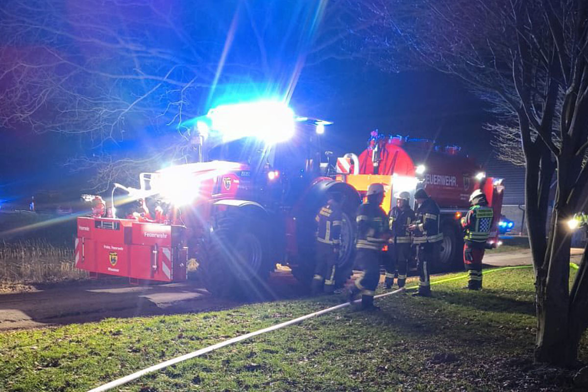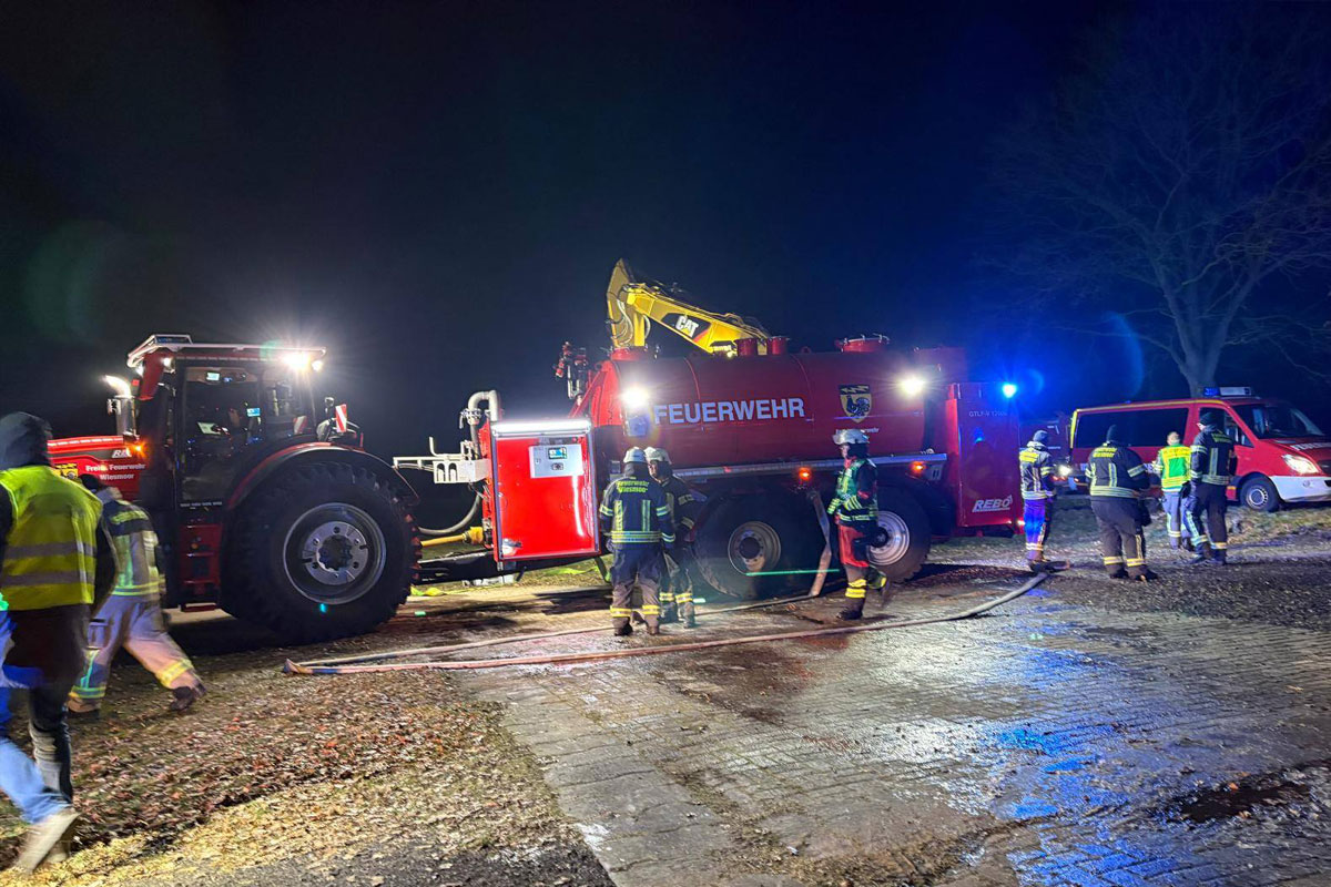 Feuerwehren einen umfangreichen Pendelverkehr ein. Tanklöschfahrzeuge brachten Wasser zur Einsatzstelle, unterstützt durch Abrollbehälter und einen Löschtraktor, die als Pufferspeicher dienten.