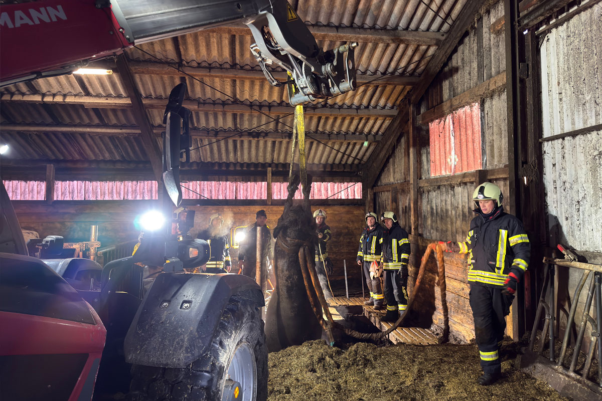 Die Situation vor Ort erwies sich eingangs zeitkritisch, da eines der Tiere bereits zum Großteil in der angestauten Gülle des gut 2,20 Meter tiefen Kellers versunken war. Den anwesenden Landwirten und Feuerwehrleuten gelang es, den Kopf der Kuh mit einer Leine zu versehen und sie so über der Oberfläche zu halten.