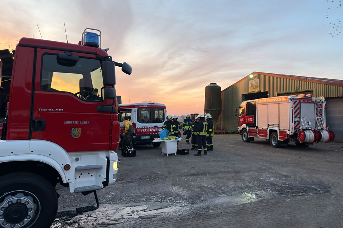 Auf einem landwirtschaftlichen Anwesen in Aurich-Brockzetel sind am Mittwochmorgen, 21.01.2026, zwei Kühe durch den Stallboden in eine Güllegrube gestürzt. Einsatzkräfte der Feuerwehr retteten die Tiere mit schwerem Gerät.