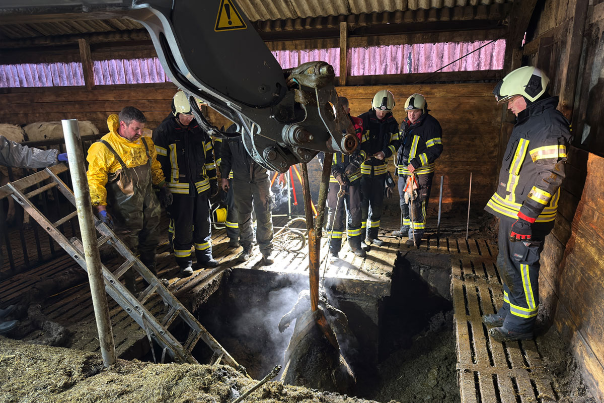 Landwirte hatten das Unglück auf ihrer Hofanlage gegen 07:00 Uhr bemerkt und nach ersten vergeblichen Bemühungen, die Tiere selbst zu retten, schließlich einen Notruf abgesetzt.