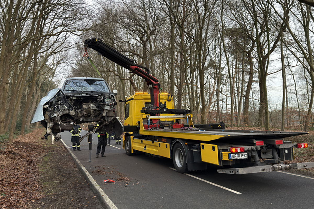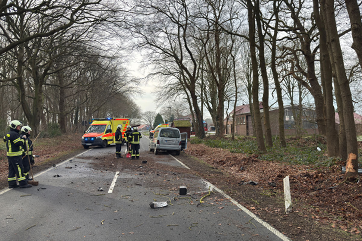 Nach einem schweren Verkehrsunfall in Aurich-Brockzetel ist am Mittwochmittag, 22.01.2026, ein Auto gegen einen Baum geprallt. Durch die Wucht des Aufpralls wurde der Motorblock aus dem Fahrzeug gerissen. Zwei Insassen wurden verletzt und in Krankenhäuser gebracht.