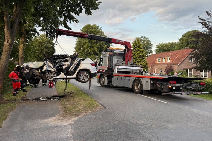 Ein Abschlepper übernahm die Bergung des total zerstörten Autos. Neben dem Abstreuen ausgetretener Betriebsstoffe mussten die Feuerwehrleute im Anschluss auch den aufgrund des Aufpralls erheblich beschädigten und dadurch umsturzbedrohten Baum unter Zuhilfenahme einer Kettensäge fällen.