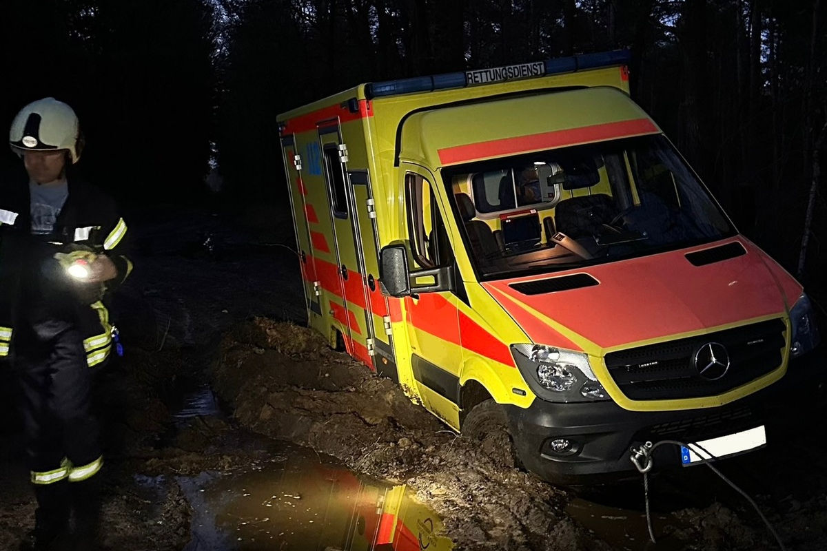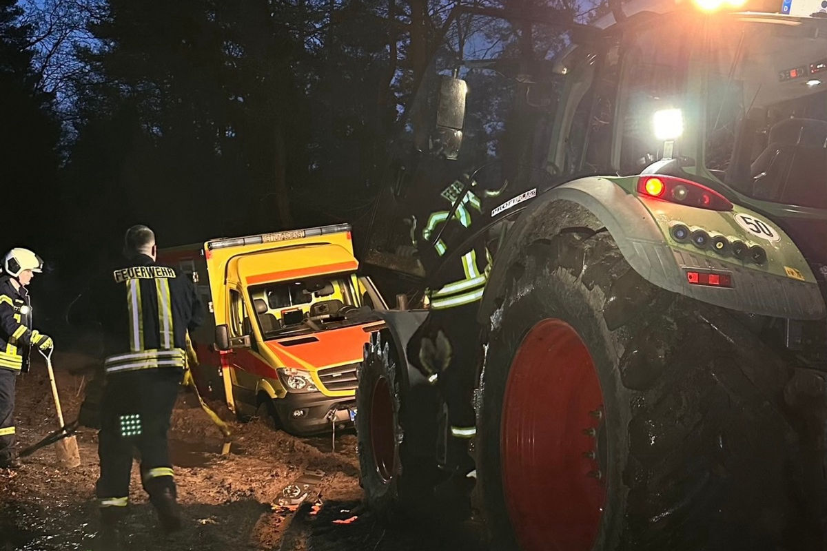 Heute, 4. April 2026, blieb in Aurich-Wiesens ein Rettungswagen auf einem Waldweg im Schlamm stecken. Die Feuerwehr befreite das Fahrzeug mithilfe eines Traktors; verletzt wurde niemand.