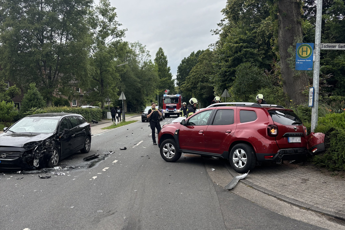 Durch den Aufprall in Höhe der Einmündung Eschener Gaste waren erhebliche Beschädigungen an den Autos entstanden, sodass größere Mengen Betriebsstoffe auf die von Trümmern übersähte Fahrbahn austraten.