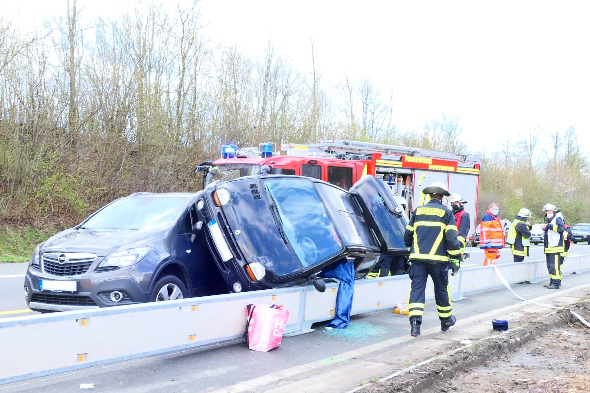 Gegen 14.00 Uhr wurde die Feuerwehr zur Bundesstraße 1, Fahrtrichtung Unna, alarmiert. Dort ereignete sich wenige hundert Meter vor der Abfahrt Holzwickede ein Unfall zwischen zwei PKW.