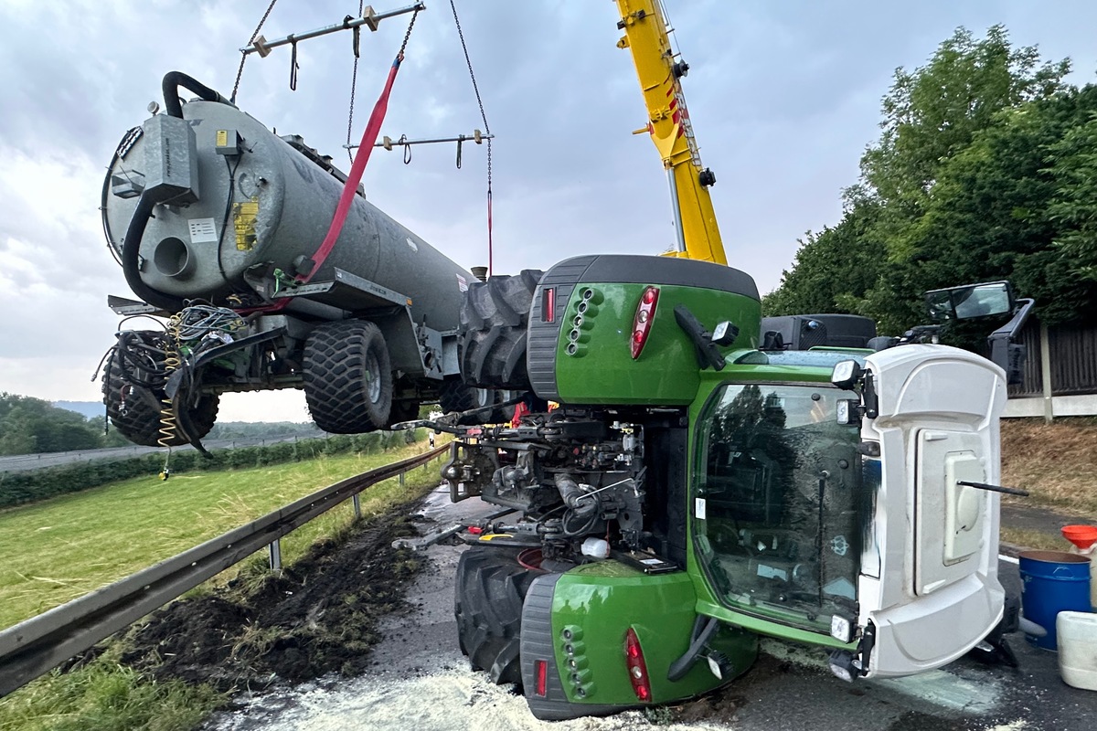 Bei einem von einer landwirtschaftlichen Zugmaschine gezogenen Jauchefass, das mit 27.000 Litern gefüllt war, war während der Fahrt aus noch ungeklärter Ursache mutmasslich ein Reifen geplatzt. Beim Eintreffen der Feuerwehr hing das Jauchefass in der Leitplanke und die Zugmaschine lag auf der Seite. Der Fahrer war glücklicherweise unverletzt und hatte sich selbständig aus dem Fahrzeug befreien können. Das Fahrzeug hatte nicht gebrannt.