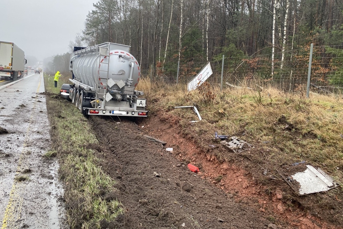 Um einem Überholenden Platz zu machen, zog ein 35-Jähriger Sattelzug-Fahrer etwas zu weit nach rechts und kam dabei von der Fahrbahn ab. Der Sattelzug fuhr in den Grünstreifen und kam dort im aufgeweichten Erdreich zum Stehen. Der Fahrer hatte Glück im Unglück und blieb unverletzt.
