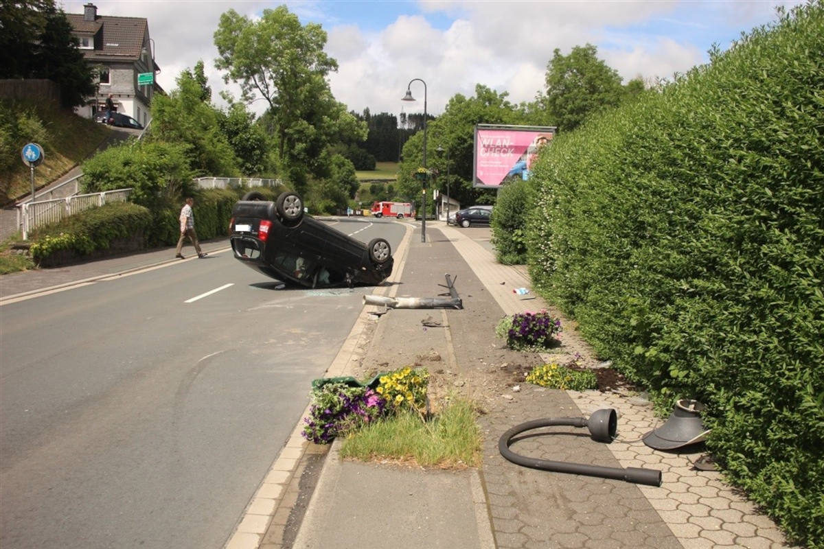 Der 55-jährige Kia-Fahrer war gegen 14:30 Uhr auf der Astenbergstraße in Fahrtrichtung Ortsausgang Bad Berleburg unterwegs. Aus bislang nicht bekannter Ursache kam er nach rechts von der Fahrbahn ab und kollidierte mit einer Straßenlaterne. Hierbei kippte das Auto um und der Wagen kam auf dem Fahrzeugdach zum Liegen. Der Fahrer musste verletzt in ein nahegelegenes Krankenhaus gebracht werden.