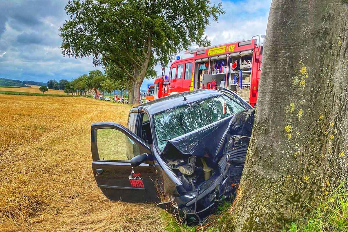 Am Samstagmittag befuhr der Fahrer eines schwarzen Fiat Punto die L 820 von Dringenberg in Richtung Fölsen. Kurz vor einem Waldstück kam der 62 jährige Fahrer nach rechts von der Fahrbahn ab und prallte frontal gegen einen der Straßenbäume.