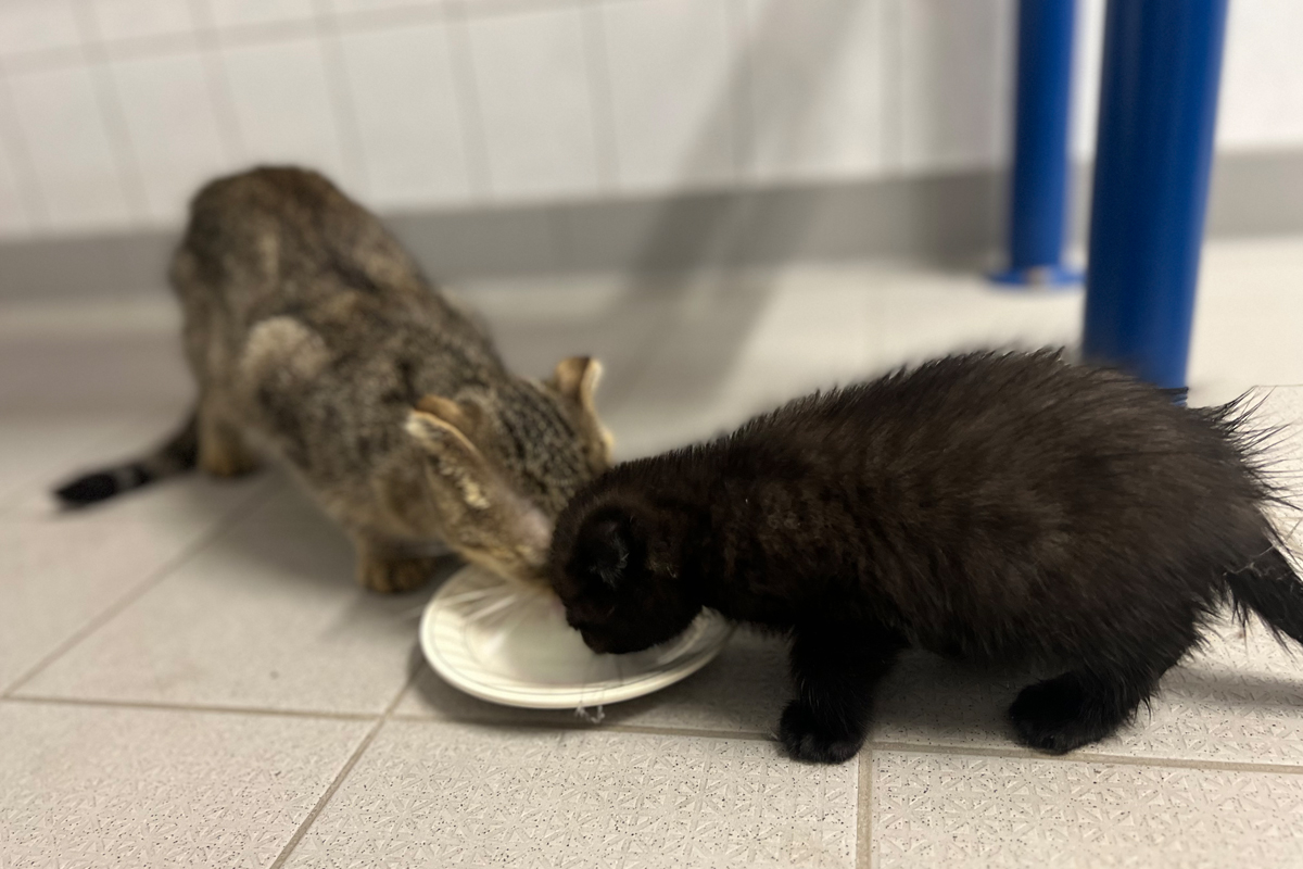 Die beiden Kätzchen stärkten sich erstmal auf der Polizeiwache. (Bildquelle: Bundespolizeiinspektion Kaiserslautern)