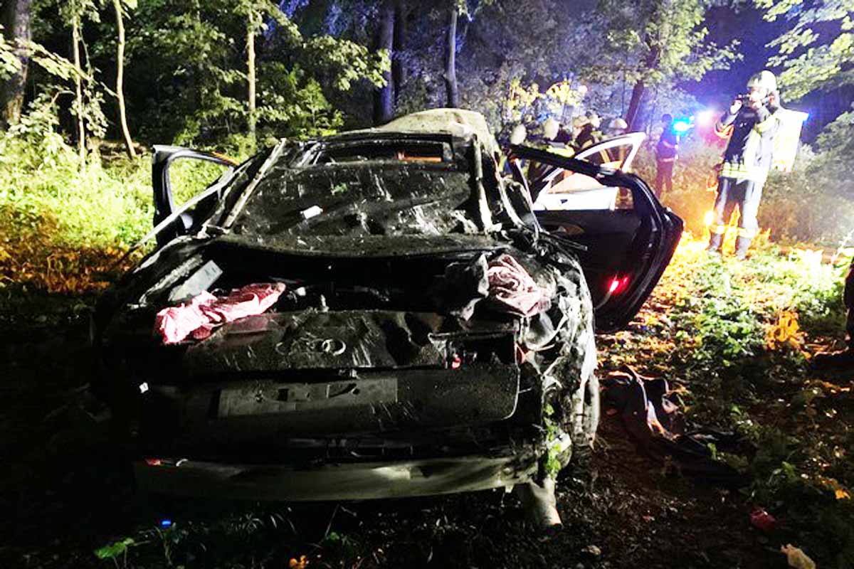 Der Audi liegt völlig zerstört auf einem Waldweg zwischen Wüsten und Bad Salzuflen (Bildquelle: Freiwillige Feuerwehr Bad Salzuflen)