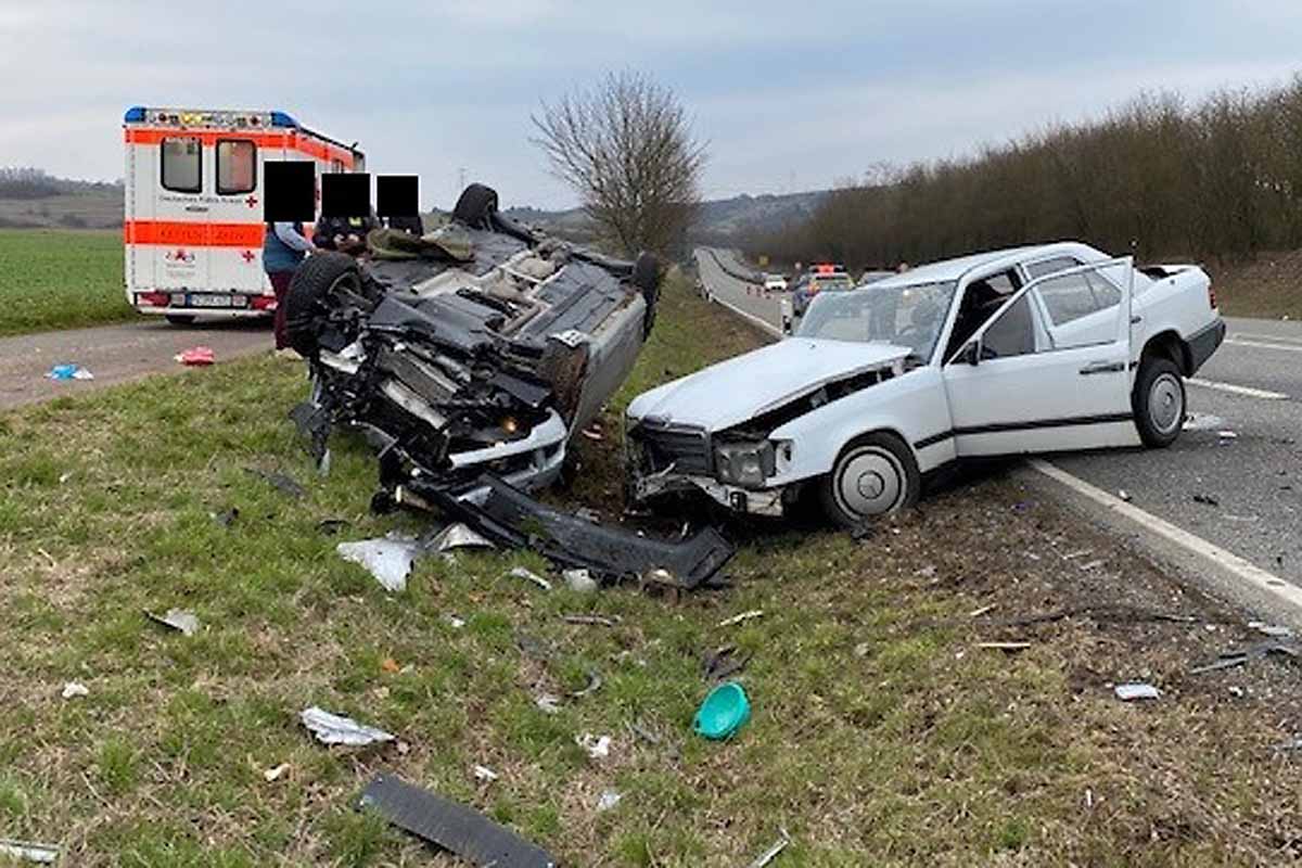Der aus Richtung Bad Kreuznach kommende graue Mercedes, besetzt mit drei jungen Männern überschlug sich durch die Wucht des Aufpralles und kam auf dem Dach zum Liegen.