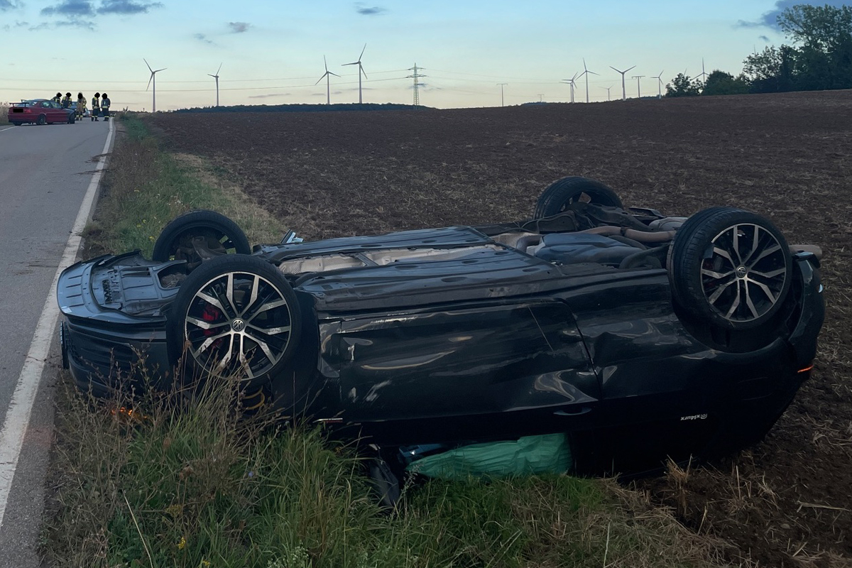 Beim Abbiegevorgang kam es zu einer Kollision mit einem bevorrechtigten PKW, der sich daraufhin im angrenzenden Feld überschlug und auf dem Dach zum Liegen kam.