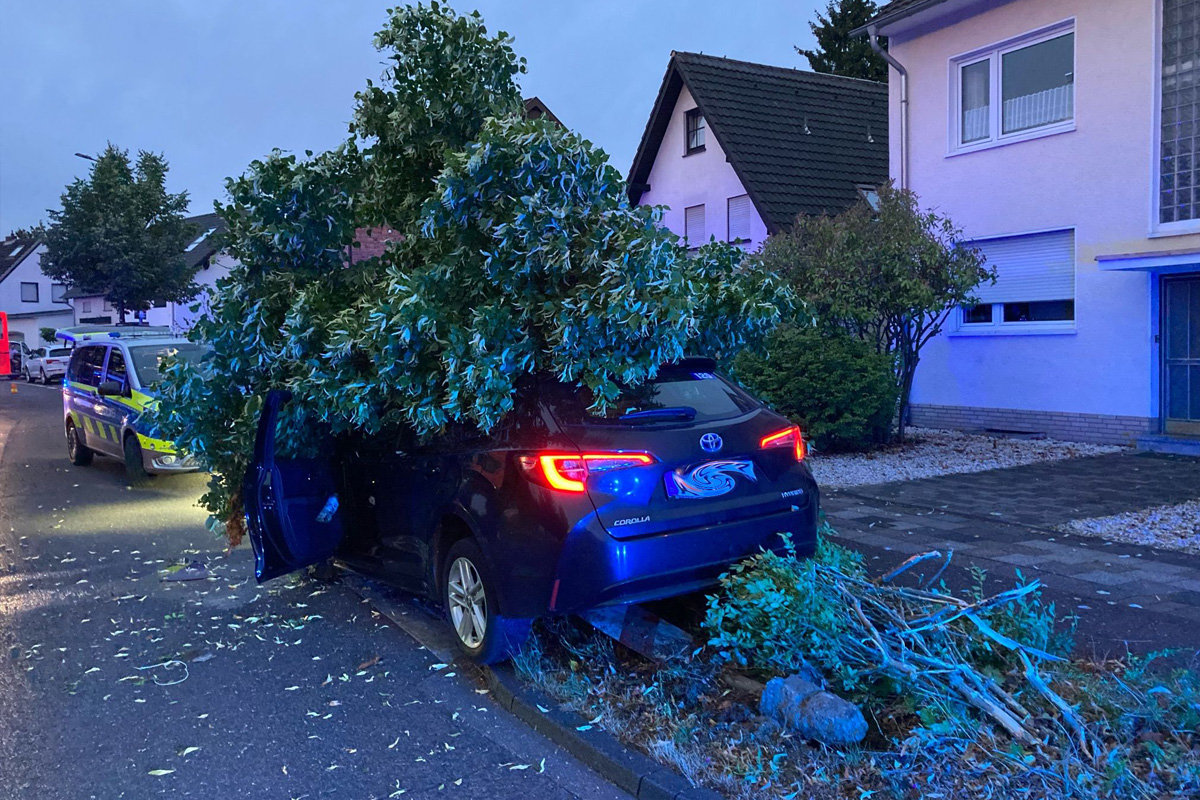 In Bergisch Gladbach kam ein 26-Jähriger am Dienstag, den 8. Juli 2025, nach einem Sekundenschlaf von der Fahrbahn ab und prallte gegen einen Baum. Der Baum stürzte auf das Fahrzeug.