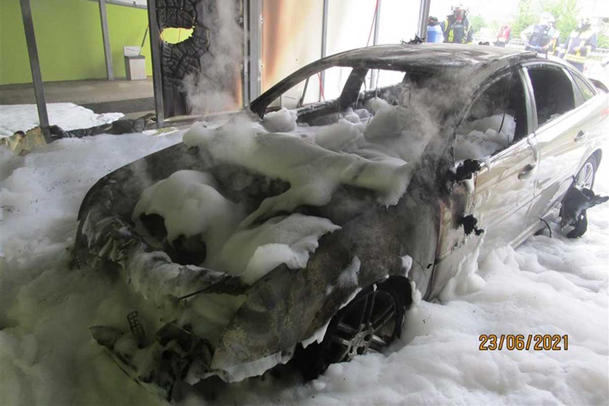 Der PKW ist komplett ausgebrannt. An der SB-Waschhalle entstand ein nicht unerheblicher Sachschaden.