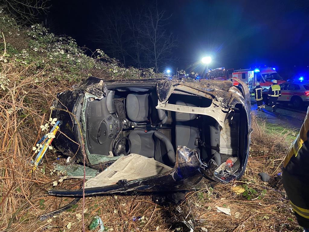 Ein PKW, besetzt mit 4 Personen, befuhr die L 47, von Bernkastel-Kues kommend in Richtung Zeltingen. Das Fahrzeug kam aus bisher ungeklärter Ursache nach links von der Fahrbahn ab und überschlug sich. Alle vier Insassen wurden zum Teil schwer, aber nicht lebensbedrohlich, verletzt. Drei von ihnen waren im Wagen eingeklemmt und mussten von der Feuerwehr befreit werden.