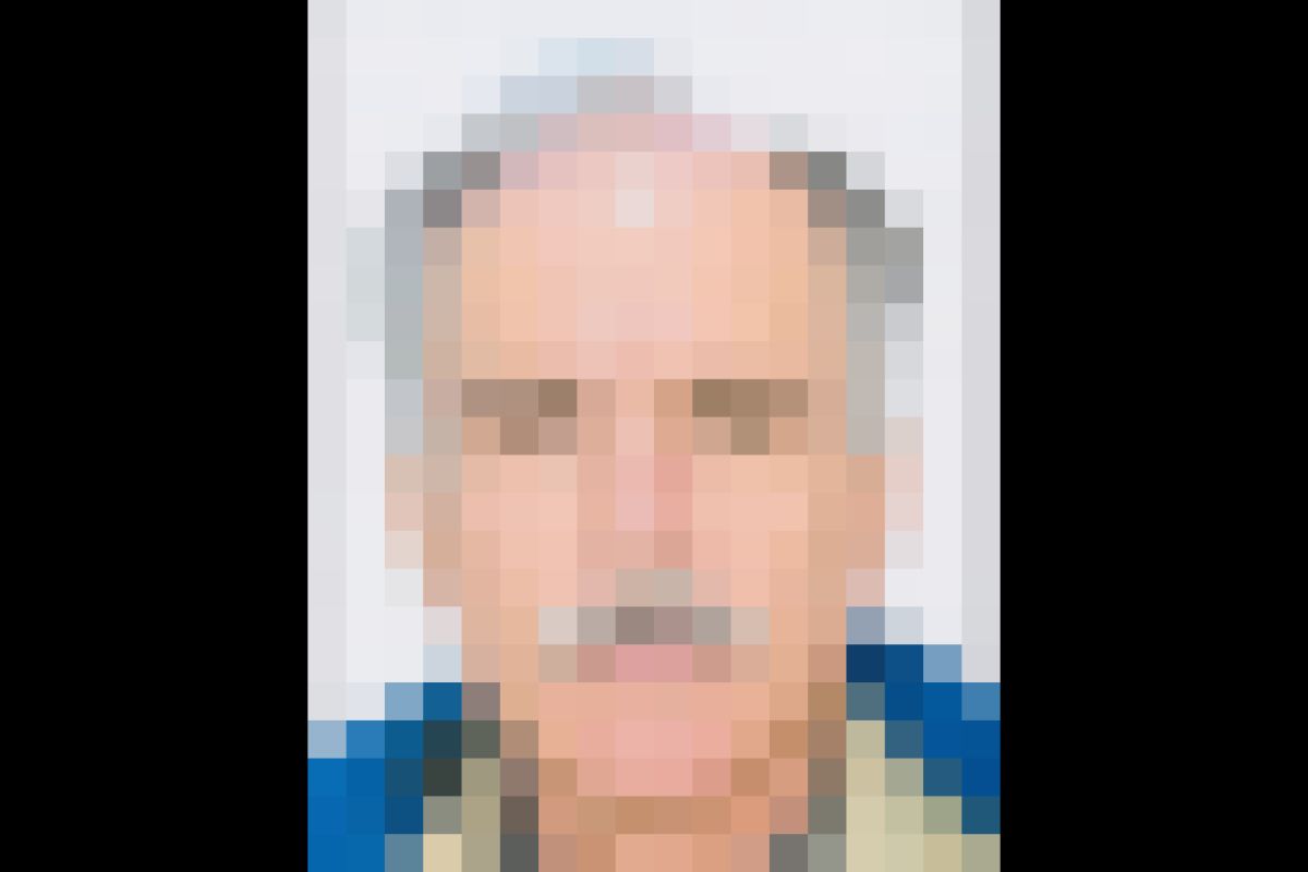 Er hat eine Halbglatze, graues Haar und ist Brillenträger. Zu seiner Bekleidung liegen keine Informationen vor.